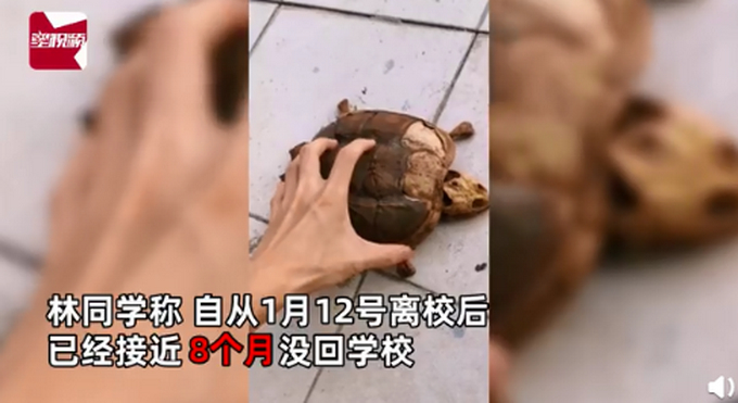 9月1日,湖北武汉科技大学林同学晒出自己的小乌龟变成干龟壳走红网络,林同学称,自从1月12号离校后,受今年新冠疫情影响,已经接近8个月没回学校,8月31日返校后,发现放在宿舍阳台的乌龟已经干壳。