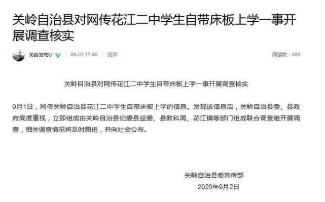 2020年9月1日,互联网大量传播关岭自治县花江二中(现花江中学)学生上学自带床板一事,关岭自治县委、县政府高度重视,成立调查组进行调查核实,积极采取有力措施,确保学生上学秩序正常。