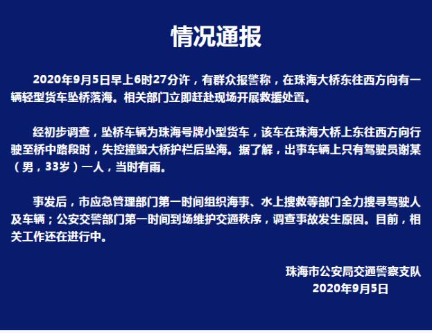 2020年9月5日早上6时27分许,有群众报警称,在珠海大桥东往西方向有一辆轻型货车坠桥落海。相关部门立即赶赴现场开展救援处置。经初步调查,坠桥车辆为珠海号牌小型货车,该车在珠海大桥上东往西方向行驶至桥中路段时,失控撞毁大桥护栏后坠海。据了解,出事车辆上只有驾驶员谢某(男,33岁)一人,当时有雨。事发后,市应急管理部门第一时间组织海事、水上搜救等部门全力搜寻驾驶人及车辆;公安交警部门第一时间到场维护交通秩序,调查事故发生原因。目前,相关工作还在进行中。珠海市公安局交通警察支队2020年9月5日原标题:珠海