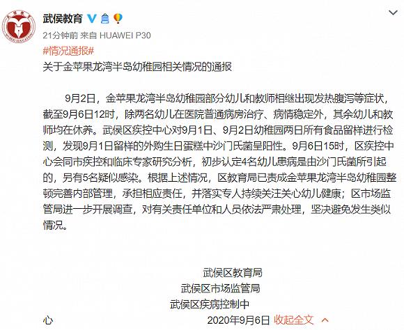 据成都市武侯区教育局官方微博通报,9月2日,金苹果龙湾半岛幼稚园部分幼儿和教师相继出现发热腹泻等症状,截至9月6日12时,除两名幼儿在医院普通病房治疗、病情稳定外,其余幼儿和教师均在休养。武侯区疾控中心对9月1日、9月2日幼稚园两日所有食品留样进行检测,发现9月1日留样的外购生日蛋糕中沙门氏菌呈阳性。9月6日15时,区疾控中心会同市疾控和临床专家研究分析,初步认定4名幼儿患病是由沙门氏菌所引起的,另有5名疑似感染。根据上述情况,区教育局已责成金苹果龙湾半岛幼稚园整顿完善内部管理,承担相应责任,并落实专人持