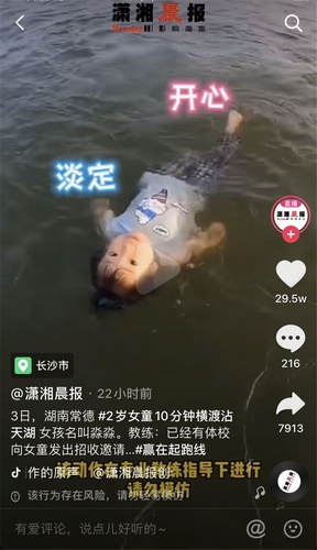 姿势太美了!2岁女童10分钟横渡百米沾天湖 莫非真的是“人鱼”?