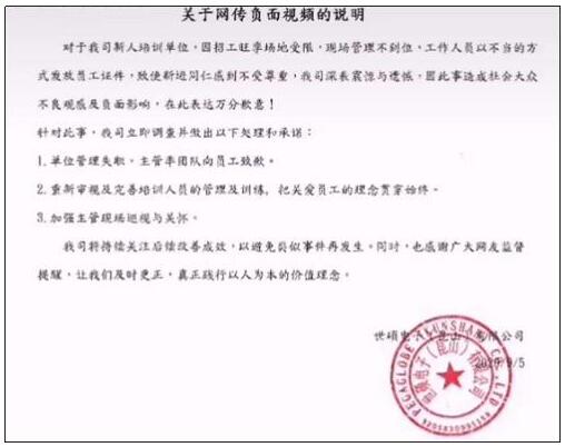 针对此事,我司立即调查并做出以下处理和承诺:1.单位管理失职,主观率团队向员工致歉。2.重新审视及完善培训人员的管理及训练,把关爱员工的理念贯穿始终。3.加强主管现场巡查与关怀。
