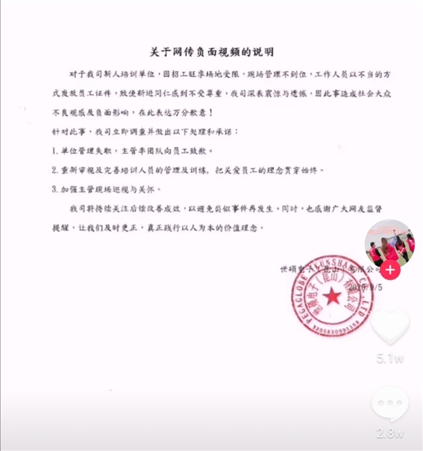 【后续来了】昆山世硕称大量员工辞职不实 针对视频内容公司公开发表道歉