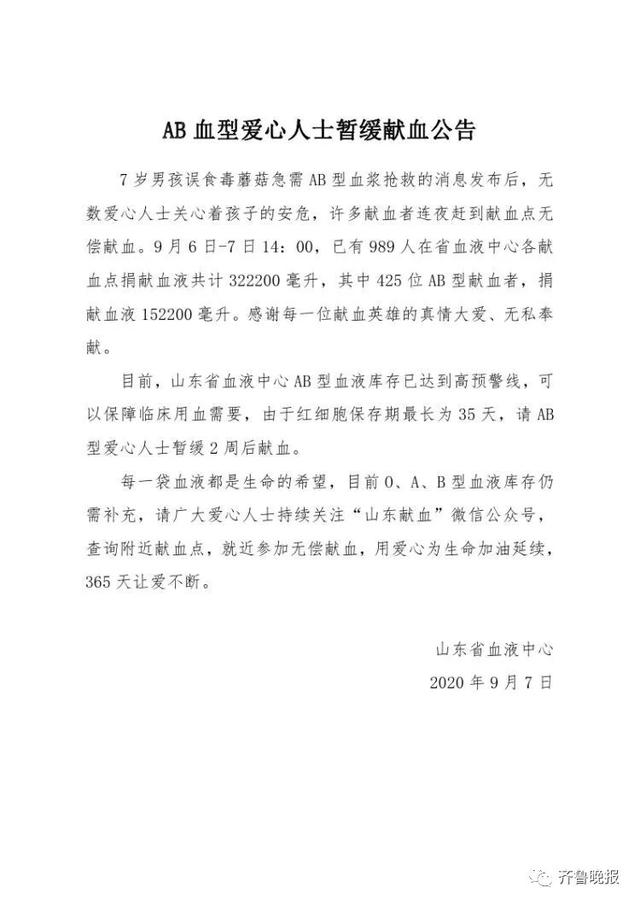 7岁男孩误食毒蘑菇急需AB型血浆抢救的消息发布后,无数爱心人士关心着孩子的安危,许多献血者连夜赶到献血点无偿献血。9月6日-7日14:00,已有989人在省血液中心各献血点捐献血液共计322200毫升,其中425位AB型献血者,捐献血液152200毫升。感谢每一位献血英雄的真情大爱、无私奉献。目前,山东省血液中心AB型血液库存已达到高预警线,可以保障临床用血需要,由于红细胞保存期最长为35天,请AB型爱心人士暂缓2周后献血。每一袋血液都是生命的希望,目前O、A、B型血液库存仍需补充,请广大爱心人士持续关注