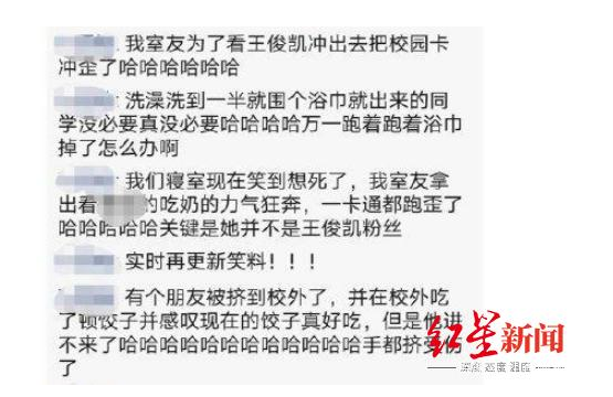 多名该校学生表示,12日晚9时许,学校里从其他学生处有消息传出,称王俊凯到学校了。不少学生纷纷走出宿舍,冒雨前往校门口,大家都挺开心的。