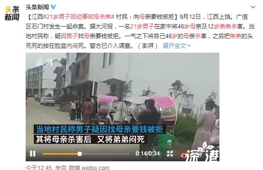 近日,一则“21岁男子因琐事弑母杀弟”的消息在网上引发关注与热议。据了解,9月12日中午,江西上饶,广信区应家乡石门村发生了一起骇人听闻的惨案,一名男子在家中将母亲及弟弟残忍杀害。21岁男子因琐事弑母杀弟据当地居民透露,行凶男子21岁,遇害两人系其46岁的母亲及12岁的弟弟。行凶男子整天好吃懒做,案发当日他向其母亲要钱。因其母亲不给,恼羞成怒的他一气之下就将母亲杀害,同时又担心弟弟去求救,杀红眼的男子又将弟弟闷死在装满水的脸盆中。目前,警方已将嫌疑人控制,具体情况进一步调查中。网友