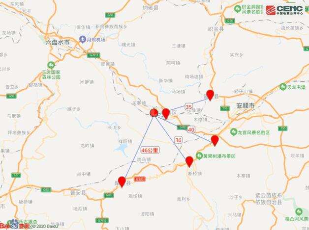 震中距六枝特区7公里、距普定县35公里、距关岭布依族苗族自治县36公里、距镇宁布依族苗族自治县40公里、距晴隆县46公里,距安顺市54公里,距六盘水市72公里,距贵阳市136公里。