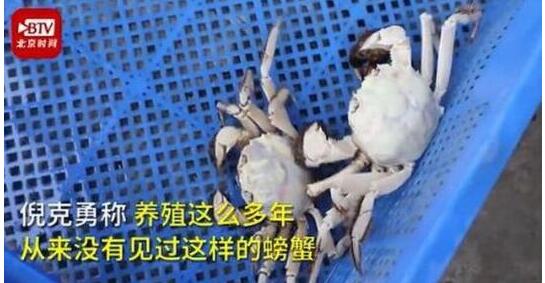 勇在自家蟹塘发现两只全身呈“汉白玉”色的螃蟹,从螃蟹外壳已经能够看到蟹黄,甚至螃蟹的脚也都是白色。倪克勇称: 养殖这么多年从来没见过这样的螃蟹。水产专家汪沐博士表示,汉白玉色的螃蟹疑因是基因问题,不影响正常食用。