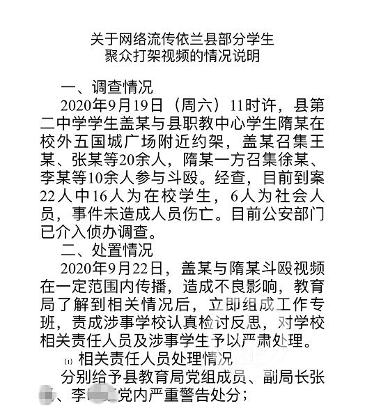 9月23日,上游新闻记者从黑龙江省依兰县教育局了解到:9月19日11时许,依兰县第二中学学生盖某与该县职教中心学生隋某,在校外五国城广场附近约架。盖某召集王某、张某等20余人,隋某召集徐某、李某等10余人参与斗殴。经查,目前到案22人中16人为在校学生,6人为社会人员,事件未造成人员伤亡。目前公安部门已介入侦办。