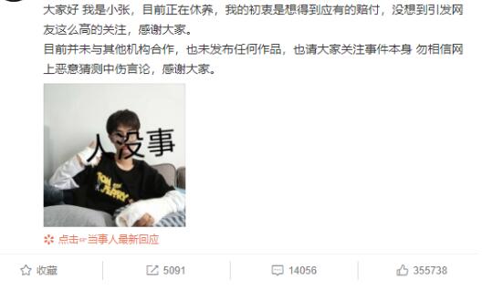 而昨日,小张本人在微博上发文,称初衷是想得到应有的赔付,没想到引发网友这么高的关注,感谢大家。目前并未与其他机构合作,也未发布任何作品,也请大家关注事件本身 勿相信网上恶意猜测中伤言论。小张还表示,其他平台均未更新任何动态,请勿被骗理智对待。