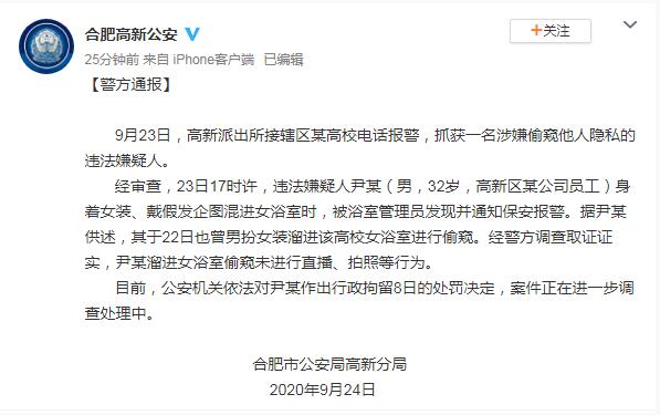 9月23日,高新派出所接辖区某高校电话报警,抓获一名涉嫌偷窥他人隐私的违法嫌疑人。经审查,23日17时许,违法嫌疑人尹某(男,32岁,高新区某公司员工)身着女装、戴假发企图混进女浴室时,被浴室管理员发现并通知保安报警。据尹某供述,其于22日也曾男扮女装溜进该高校女浴室进行偷窥。经警方调查取证证实,尹某溜进女浴室偷窥未进行直播、拍照等行为。 目前,公安机关依法对尹某作出行政拘留8日的处罚决定,案件正在进一步调查处理中。 合肥市公安局高新分局 2020年9月24日原标题:合肥警方:一男子扮女装企图混进高校女浴