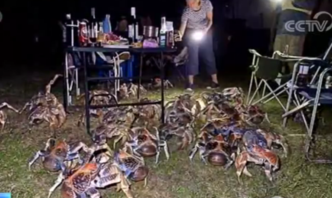 近日,在澳大利亚圣诞岛,艾米·卢蒂克一家人享受露天烧烤时,突然被50多只巨蟹包围。螃蟹们似乎闻到烧烤香味,从四面八方蜂拥而至。有些“心急”的螃蟹,甚至爬上了饭桌和烧烤架。不过,这种椰子蟹在澳大利亚属于保护动物,禁止食用。公开资料显示,椰子蟹是一种寄居蟹,能长到1米长,不仅是最大的陆生蟹类,也是最大的陆生节肢动物。体型硕大,体重最高可达6千克,椰子蟹的外壳坚硬,有两只强壮有力的巨螯,是爬树高手,尤其善于攀爬笔直的椰子树,因为它们可以用强壮的双螯剥开坚硬的椰子壳,以吃其中