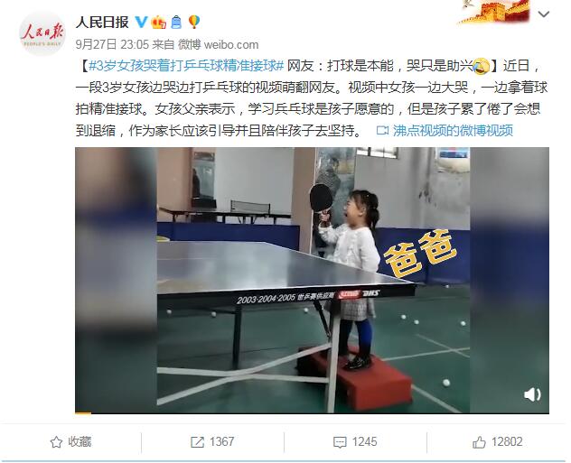 哭是助兴!3岁女孩哭着打乒乓仍精准接到 累了倦了想到退缩了