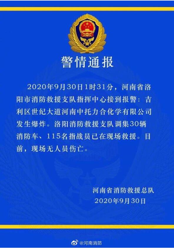 据河南省消防救援总队官方微博9月30日消息,30日1时31分,河南省洛阳市消防救援支队指挥中心接到报警:吉利区世纪大道河南中托力合化学有限公司发生爆炸。洛阳消防救援支队调集30辆消防车、115名指战员已在现场救援。目前,现场无人员伤亡。原标题:突发!河南洛阳一化工企业发生爆炸