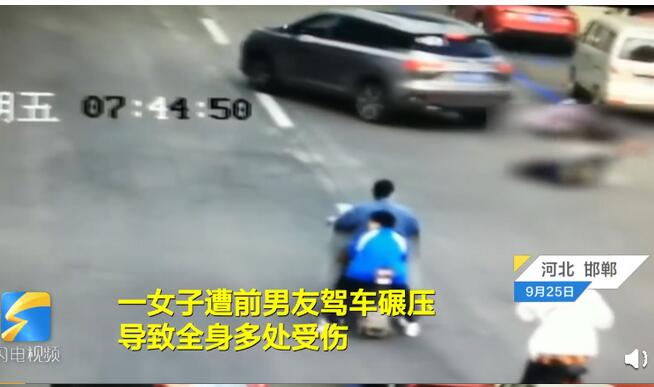 9月25日,河北邯郸。一女子遭前男友杨某驾车碾压,导致全身多处受伤。监控视频显示,该男子驾车碾压该名女子之后,又开车倒了回来试图二次碾压,好在身边的大爷及时将该女子一把拉回。随后路人纷纷上前帮忙。还有好心人拨打了110和120,女子被送到医院后已经昏迷,紧急进行了两次手术,身上缝合了30多针。但万幸的是,没有造成骨折,内脏也没有损伤。相关新闻:纪检组提前介入男子开车碾压女子 单位曾派人劝其投案9月29日,河北邯郸男子因感情纠纷开车反复碾压一女子引关注。永年区税务局称,犯罪嫌疑人杨某系该单位第二分局公职人员