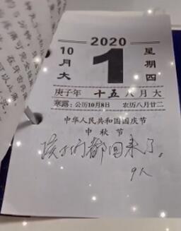 10月3日,黑龙江佳木斯,81岁的爷爷在日历写下孩子们都回来了的视频走红网络。孙女许佳琦称在爷爷家桌子上写笔记时翻台历,偶然发现爷爷大大小小的事都会记在日历上,当翻到10月1日看到爷爷记下孩子们都回来了时感动哭了。她称爷爷奶奶特别重视家庭氛围,很期盼这一天,过年过节在他们眼里都很重要。他们身体没有以前好,应该多回家陪陪老人。网友评论:原标题:孙女发现爷爷在日历写孩子们都回来了,9人 网友:看哭了