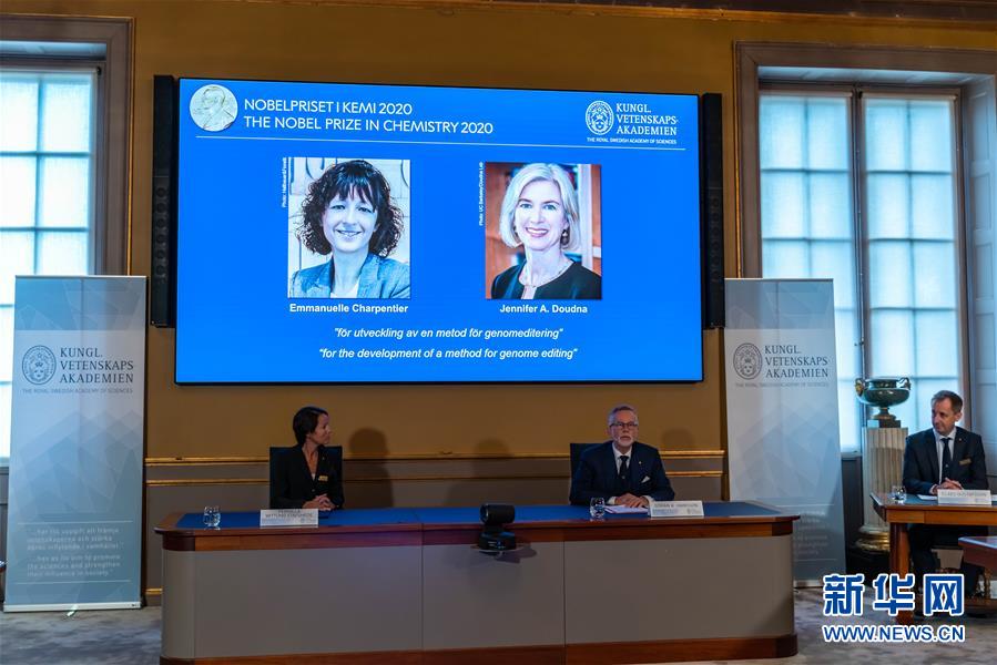 10月7日,在瑞典斯德哥尔摩,瑞典皇家科学院公布2020年诺贝尔化学奖获得者。 新华社发(魏学超摄)新华社斯德哥尔摩10月7日电 瑞典皇家科学院7日宣布,将2020年诺贝尔化学奖授予法国女科学家埃玛纽埃勒·沙尔庞捷和美国女科学家珍妮弗·道德纳,以表彰她们在基因组编辑方法研究领域作出的贡献。瑞典皇家科学院常任秘书戈兰·汉松当天在皇家科学院公布了获奖者名单及主要成就。汉松说,今年的获奖研究成果是“基因剪刀——重写生命密码的工具&rd