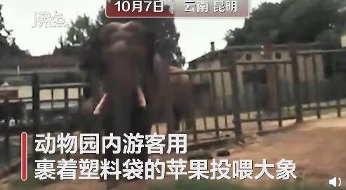 7日,昆明动物园,游客将一个裹着塑料袋的苹果扔给大象,致大象误食。工作人员表示,这种事情时有发生,会在大象误食后采取相
