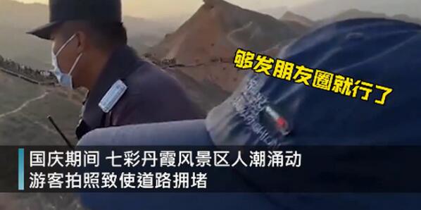 10月8日,甘肃张掖,七彩丹霞风景区人潮涌动,游客拍照致使道路拥堵,现场一保安在护栏外维持秩序时金句频出:没必要拍那么多,够发朋友圈就行。