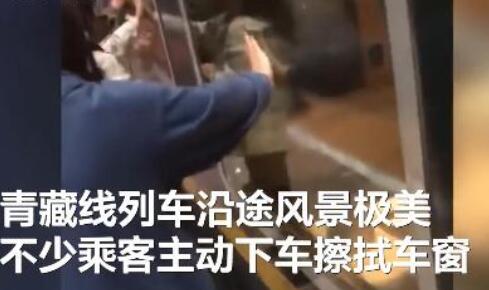 【乘客坐火车为看风景集体擦车窗】巍峨的唐古拉雪山、澄澈的高原湖泊、蓝天白云草原戈壁……为了更好看清这些沿途美景,青藏线列车上的不少乘客,在站台主动擦拭车窗↓