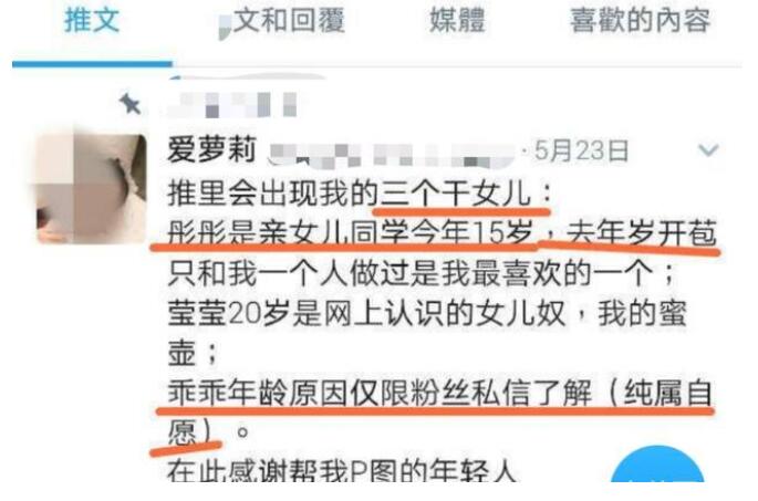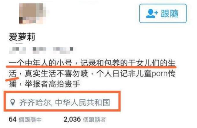 17日,有网友爆料,一名男子在网络上炫耀包养未成年少女,晒出多名女生私密照片,账号定位在黑龙江省齐齐哈尔市。爆料者称,涉事男子社交账号名为“爱萝莉”,自我介绍信息栏中写道“一个中年人的小号,记录包养干女儿们的生活,真实生活不喜勿喷”。该男子自称有三个干女儿,其中一人20岁,另两人还是未成年少女。