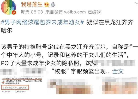 17日,有网友爆料,一名男子在网络上炫耀包养未成年少女,晒出多名女生私密照片,账号定位在黑龙江省齐齐哈尔市。