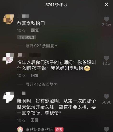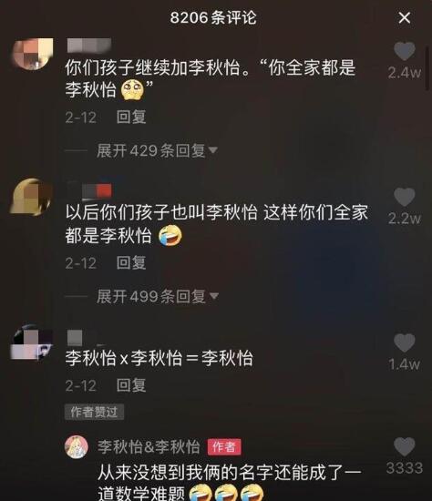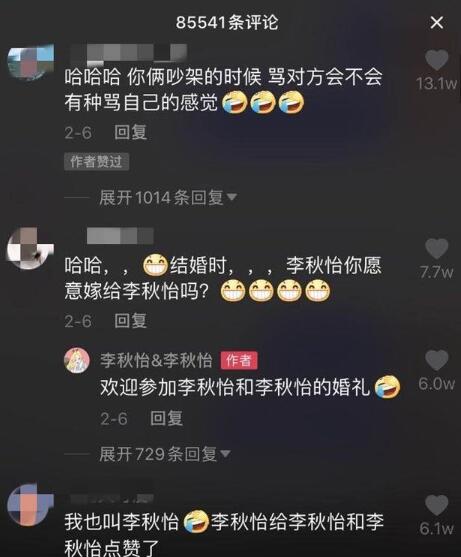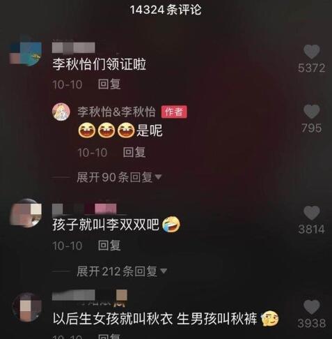 二人从相识到结婚的消息,不仅得到了父母的祝福,也得到了来自五湖四海网友们的庆贺。网友评论“这是要有多特别的缘分,才能让两个名字一样的人走到一起?”网友也调侃:“婚礼现场是不是得写:欢迎参加李秋怡&李秋怡的婚礼?”“以后吵嘴,是不是都像在说自己?”“以后孩子上学,母亲的名字该写谁呢?”甚至还有网友已经把两人孩子名字都取好了,“就叫李双双。”