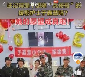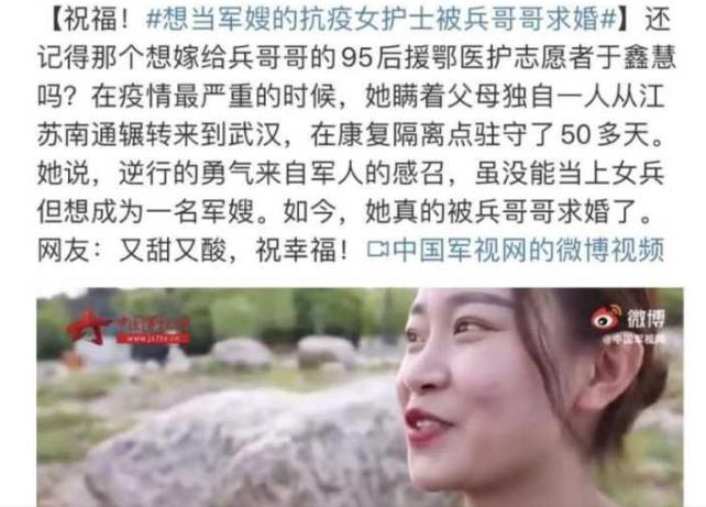半年前武汉疫情爆发,一位96年的护士隐瞒家人毅然前往一线坚守50余天。凯旋而归后她公开表示虽然没能成为女兵但想嫁给兵哥哥成为一名军嫂,并公开征婚。随后各大官媒将她当作了正能量来宣传,短短几天内就成了家喻户晓的英雄。