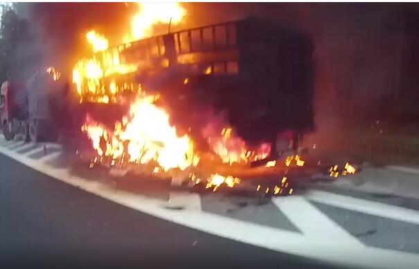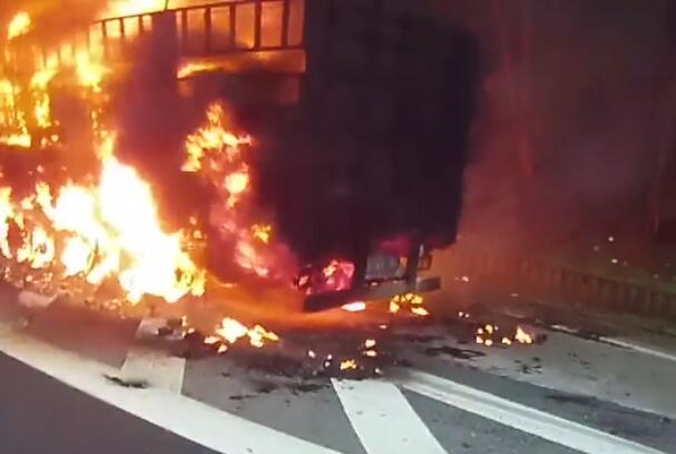 10月13日,湖南怀化一辆重型半挂牵引车因右后轮胎爆胎,轮毂与地面摩擦起火引发车载货物及篷布燃烧,引燃车上货物老干妈,火势瞬间吞没了大半个车,消防等部门及时赶赴现场处置,随后现场明火被扑灭。