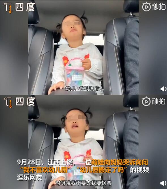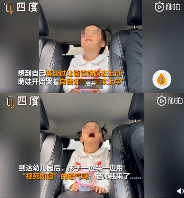 9月28日,江西上饶,一位萌娃向妈妈哭诉询问“我不喜欢幼儿园”“幼儿园搬走了吗”的视频逗乐网友。据了解,父母双方是做灯具生意。想到自己答应过让爸爸妈妈去上班,萌娃开始自我安慰“喜欢上学”,到达幼儿园后,孩子一边哭一边用“视死如归”的语气喊:老师我来了。