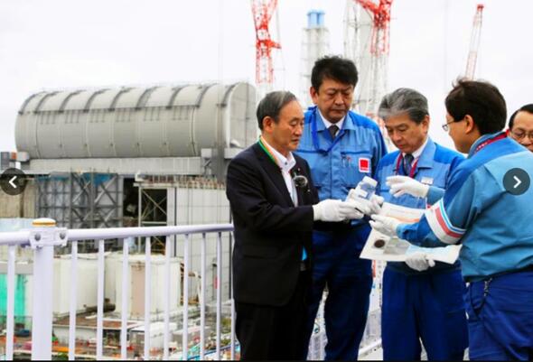 日本首相菅义伟于9月26日前往福岛第一核电站视察核污水的处理情况。(图片来源:日本《朝日新闻》网站)