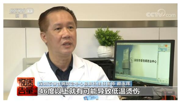 深圳市慢性病防治中心皮肤科主任医师 赖永珲:46℃以上就有可能导致低温烫伤,有时候就说他觉得舒服或者觉得要加重一点,可能时间长也没去算时间,第一次可能是五十度可能就觉得热了,后面适应了可能70℃都不觉得热,特别是如果是质量不好的,温控不好的,很容易就达到那个温度,当发现有问题的时候,可能也已经烫伤了。