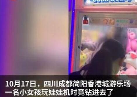 小女孩玩娃娃机时竟钻进去了。