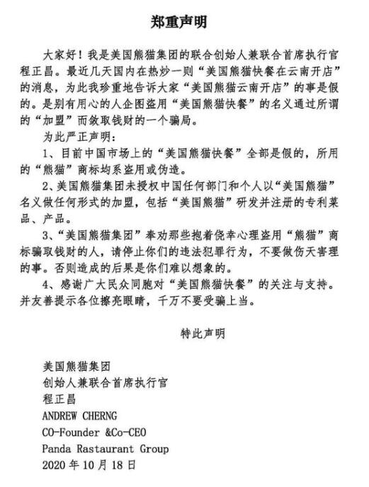 声明中称,“美国熊猫云南开店”的事是假的,是别有用心的人企图盗用“美国熊猫快餐”的名义通过所谓的“加盟”而敛财的一个骗局。