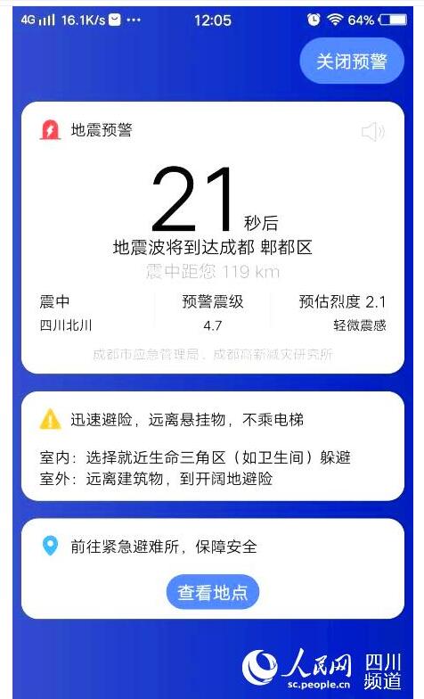 人民网成都10月21日电 (王军) 12时04分,四川省绵阳市北川县发生4.6级地震,记者从成都高新减灾研究所获悉,由其与应急管理部门联合建成的大陆地震预警网成功预警该地震。