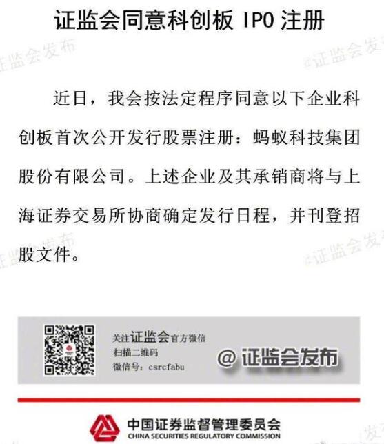 原标题:证监会同意蚂蚁科技集团股份有限公司科创板IPO注册
