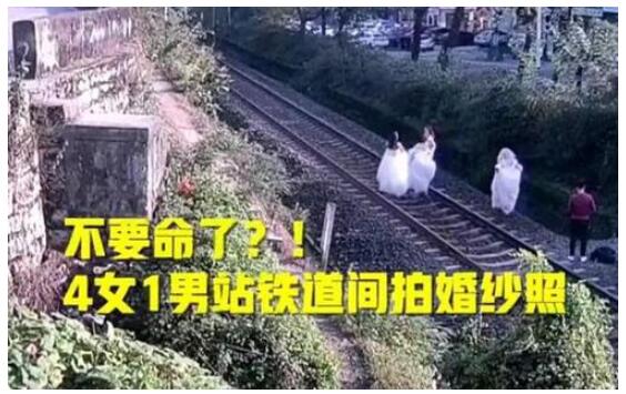 臭美不要命!4女子铁轨上拍婚纱照被罚 警察拍下四人婚纱合照