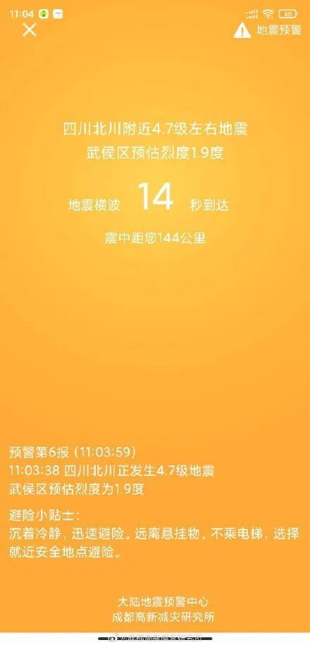 据@成都高新减灾研究所 消息,大陆地震预警网成功预警。手机、电视、大喇叭均提前发出预警。