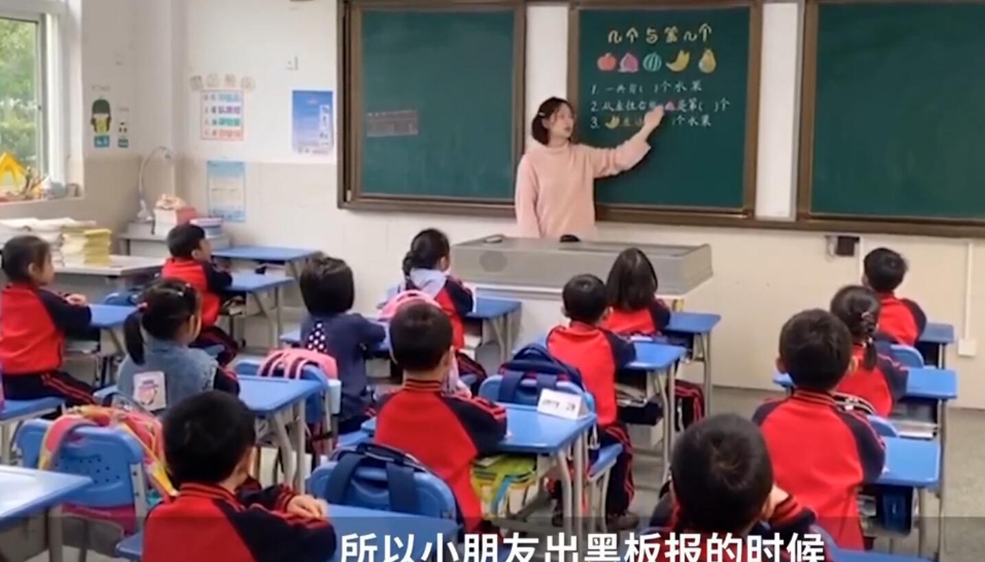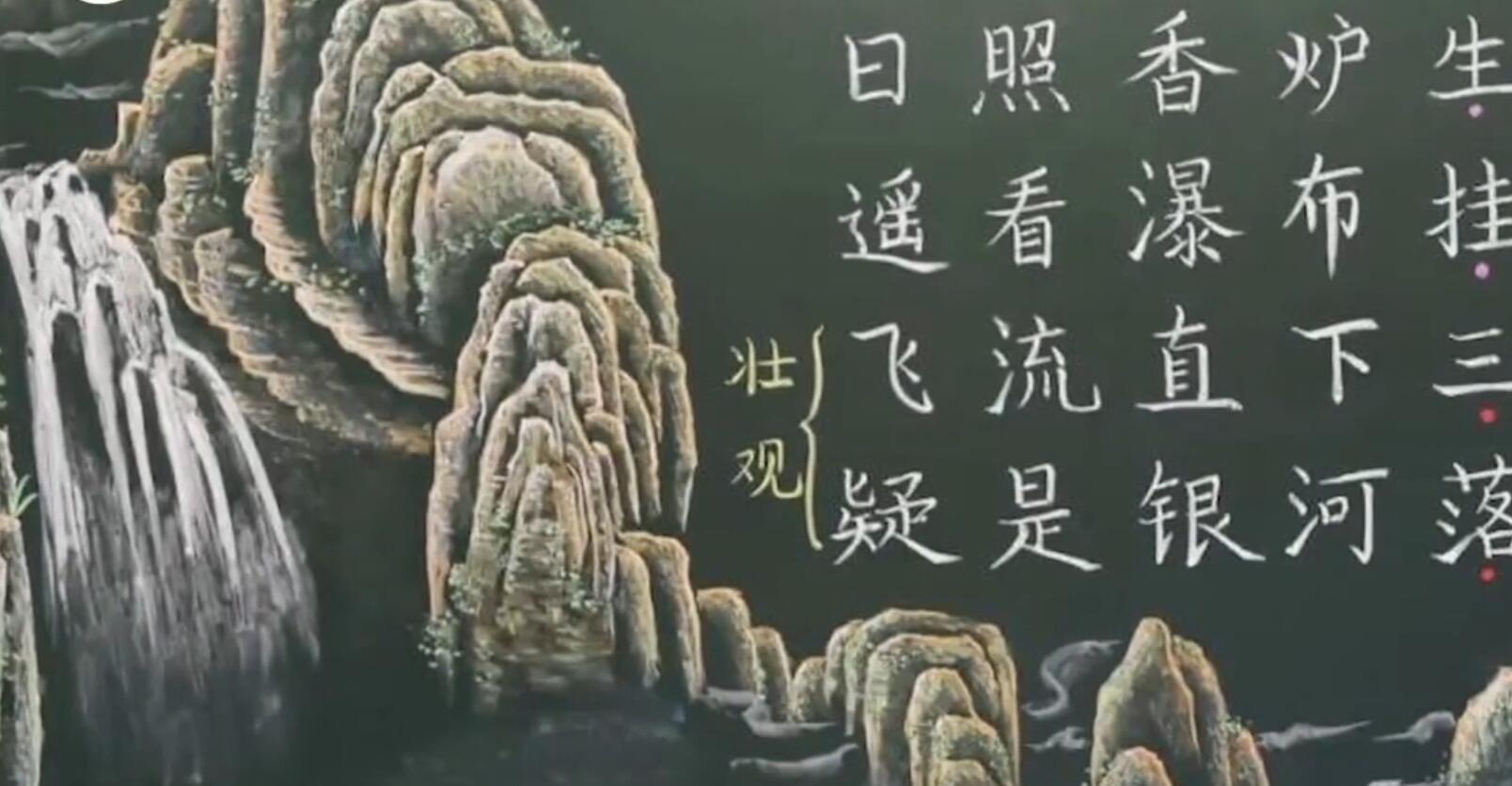 上海华江小学的数学教师张梦茜,给古诗《望庐山瀑布》画了一幅板书,粉笔勾勒的山水惟妙惟肖,堪称“神仙板书”。张老师表示,因为喜欢而自学了画画,平时教应用题时也会画画来帮助学生理解,学生都很喜欢。每学期末,她还会送亲手画的画给班里表现好的同学。