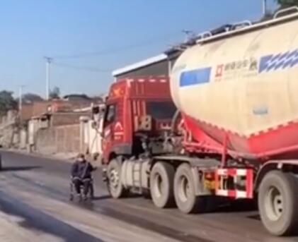 太危险!老人坐轮椅马路上拦货车要钱 到底发生了什么?
