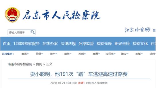 10月26日,据启东市人民检察院官方网站消息,据江苏启东市人民检察院官方日前通报,一名启东男子一年内“蹭”车过ETC,逃避缴纳高速过路费5000多元,最终被判处有期徒刑八个月。