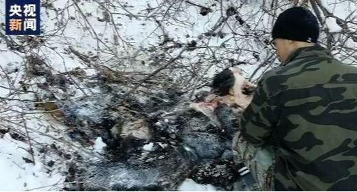 黑龙江太平沟国家级保护区管理局 刘彦林:我们赶过去,熊的腹部和颈前部被虎吃掉了,当时的肉还冒着热气。