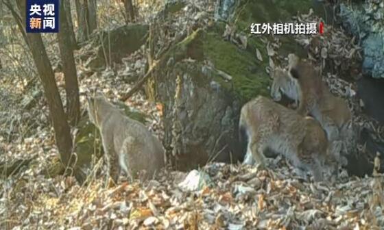 引人注意的是,太平沟中不仅有多只老虎个体,其他顶级食肉动物也同样在沟中有着稳定的种群。在另一个画面中,三只形态奇特,似猫非猫,又似豹非豹的动物,同框出现在太平沟林地中,悠闲地享受着秋日暖阳。它们是我国的二级重点保护动物,自然界的猛兽猞猁,作为一种习惯独居的猫科动物,三只结伴外出的画面可以说非常少见。同时,它们跟另一种常用来与它们的捕食能力相比,攻击力难分上下的食肉动物,狼,呈现同域分布的现象。