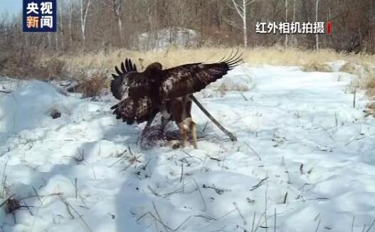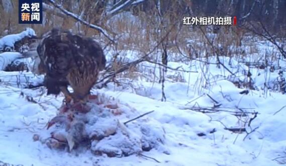 黑龙江太平沟国家级保护区管理局监测人员 张迎祥:我们去取这台相机的时候,发现那个虎没回来,这只狗被金雕给吃了。同时拍了大概有七八十段金雕吃狗的画面,拍摄的画面也非常清晰,画质也很好。金雕也是国家一级保护动物,同时一只狗能在被虎吃掉以后又被金雕给吃了,这种现象也很少有记录。