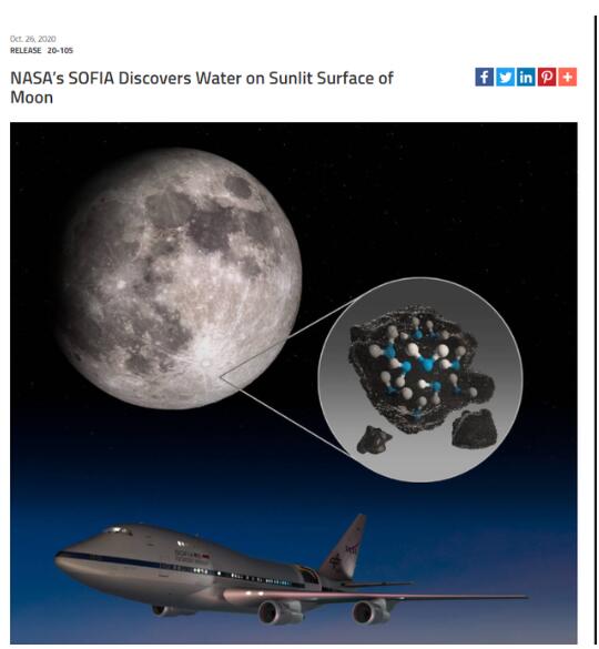 据NASA官网介绍,该机构的“索菲亚平流层红外天文台”(SOFIA)首次证实,受到阳光照射的月球表面有水存在。“这一发现表明,水可能分布在月球表面,而不仅限于寒冷、阴暗的地方。”↓