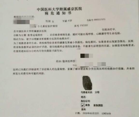 ▲5月22日,医院开具的童童病危通知书。受访者供图