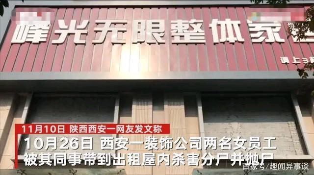 11月10日,一位网友发布消息说,10月26日,西安一家装修公司的两名女雇员被同事带到出租屋杀害并扔尸。录像显示,事发当日,犯罪嫌疑人和一名妇女乘电梯搬货物。记者从警方那里得知,嫌疑人先是与一位女同事一起进入房屋,企图强奸未遂,然后杀死她。然后,犯罪嫌疑人从社区召集另一位女同事到屋里杀死。犯罪后,犯罪嫌疑人在出租屋内分尸,并用纸板箱运到汽车上。 10月28日,犯罪嫌疑人将尸体扔到安徽省老家,随后于11月5日在西安被捕。11日,从警方获悉,犯罪嫌疑人已被拘留。原标题:强奸未遂后犯罪!西安一男子杀害2名女同事