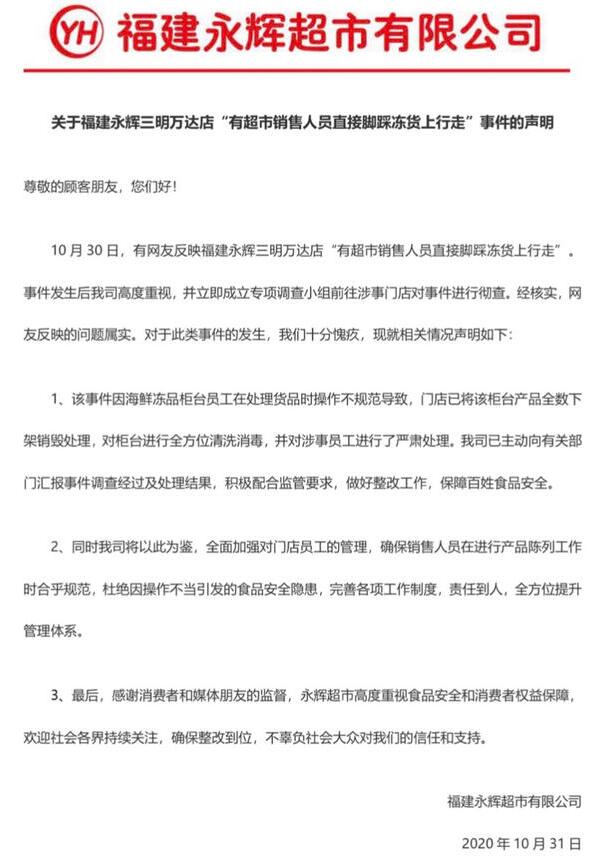 10月30日,有网友反映福建永辉三明万达店“有超市销售人员直接脚踩冻货上行走”。据网友发布的视频显示