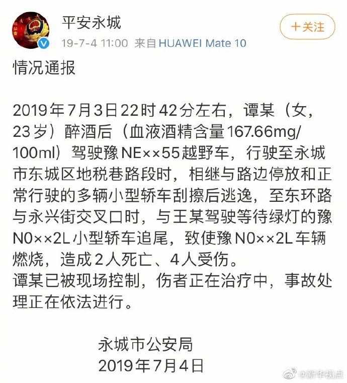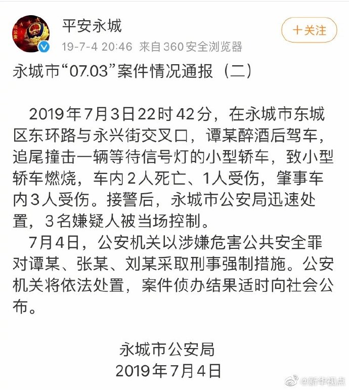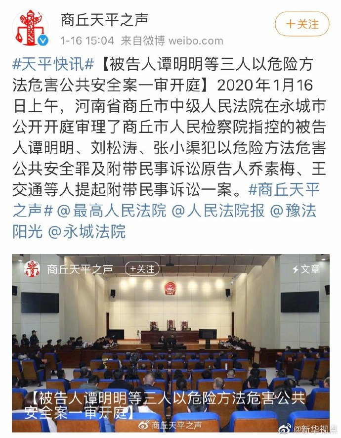 11月6日下午,河南永城谭某某等三人以危险方法危害公共安全案在永城市人民法院宣判,谭某某、刘某某、张某某均构成以危险方法危害公共安全罪。主犯谭某某被