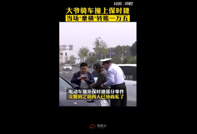 近日,江苏南京一大爷骑电动车撞上保时捷,当场豪横给对方转账,金额震住交警。对此你怎么看?原标题:大爷骑车撞上保时捷 当场转账一万五